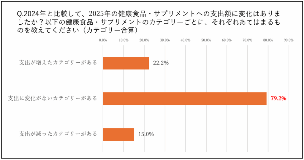 現在、健康食品・サプリメントを利用している方に、2024年と比較して、2025年の健康食品・サプリメントへの支出額に変化があったかを尋ねたところ、全20カテゴリー中19カテゴリーにおいて「支出に変化がない」と答えた方が過半数を占めました。このことから物価高による買い控えの広がりは限定的であると考えられます(図1)。