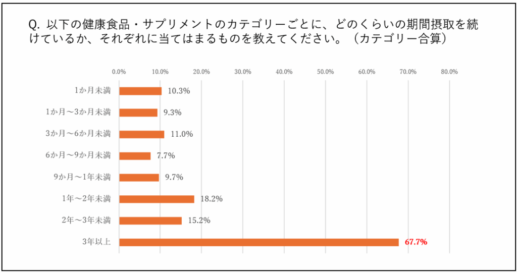 また、大半のカテゴリーで「3年以上継続利用している」と回答した方が50%以上いることにより、一度生活に定着した健康食品は家計が厳しい状況でも購入が続けられる、つまり「必需品」と考えられている可能性がうかがえます(図2)。