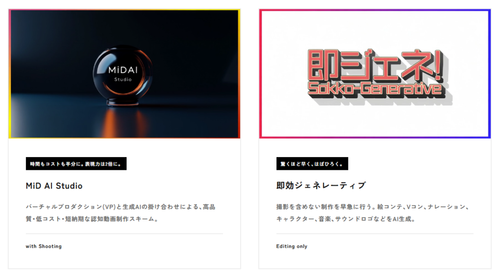 ■事業内容 :AIを活用したブランドクリエイティブ制作事業、バーチャルプロダクション活用動画制作(MiD AI Studio)、生成AIによる動画制作ソリューション(即効ジェネレーティブ)等の提供